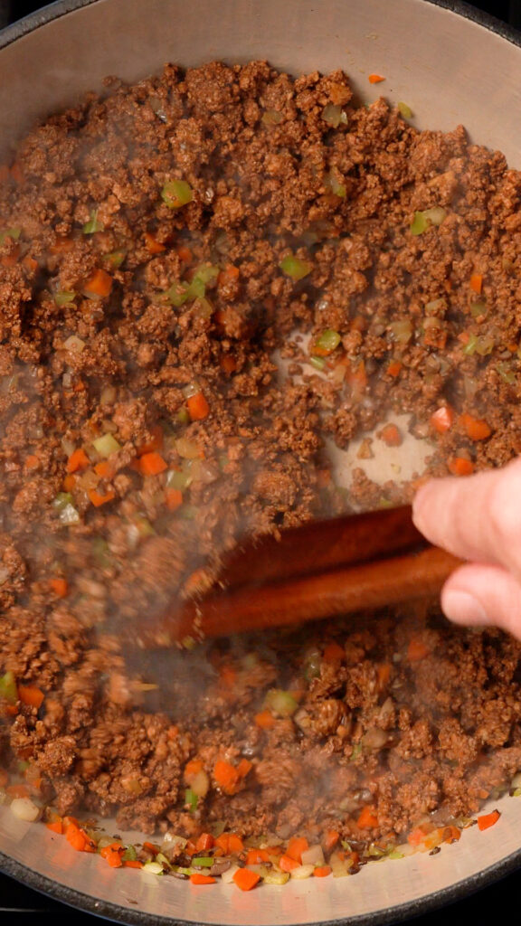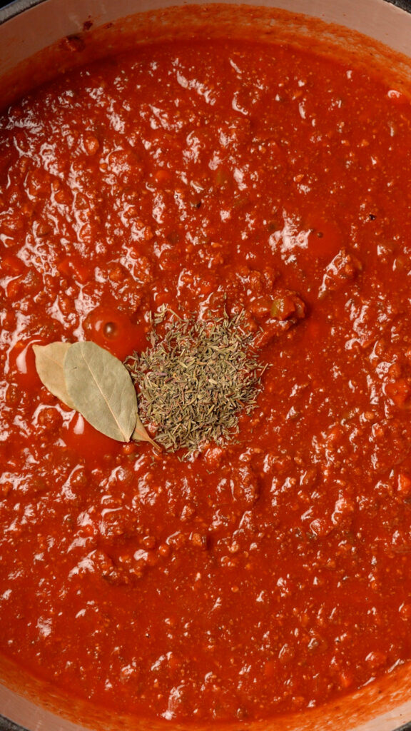 - Add in the Red or White Wine (or Veggie Broth) and stir to incorporate. Then add the Crushed Tomatoes or Passata, Vegan Worcestershire, Dried Thyme and Bay Leaves. Stir to incorporate.