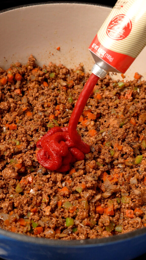 - Next add in the tomato paste. Stir to distribute it evenly. Cook for 3 minutes, stirring often.