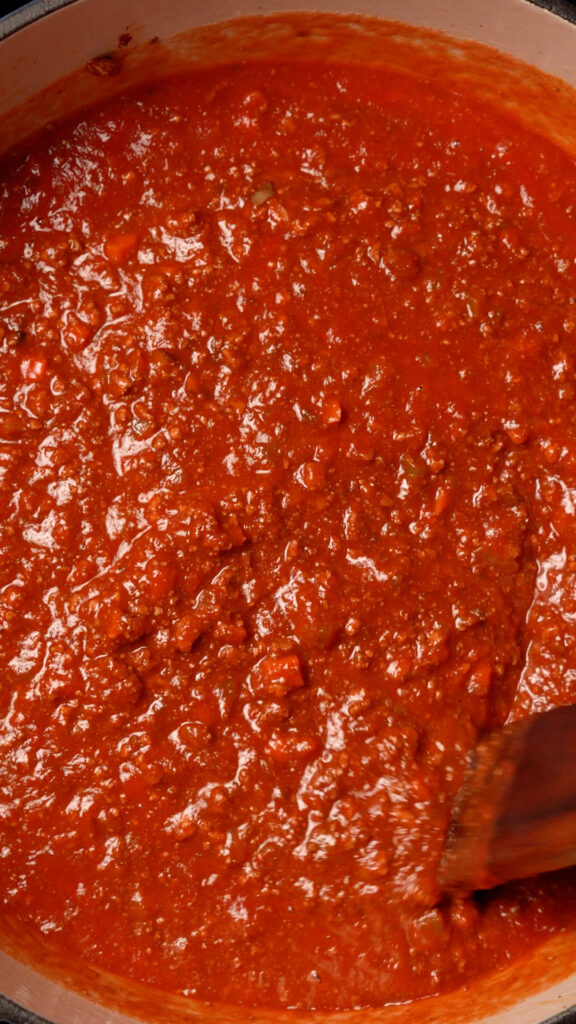 - Simmer for 1 – 2 hours, depending on your patience (I usually do 1 and it’s super good!) Stirring every now and then. If it’s reducing too much, lower the heat, and add 1/4 – 1/2 a cup of water and stir to loosen.