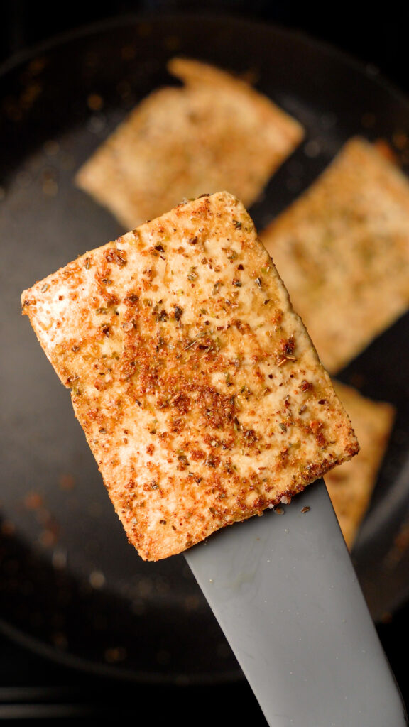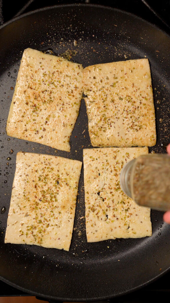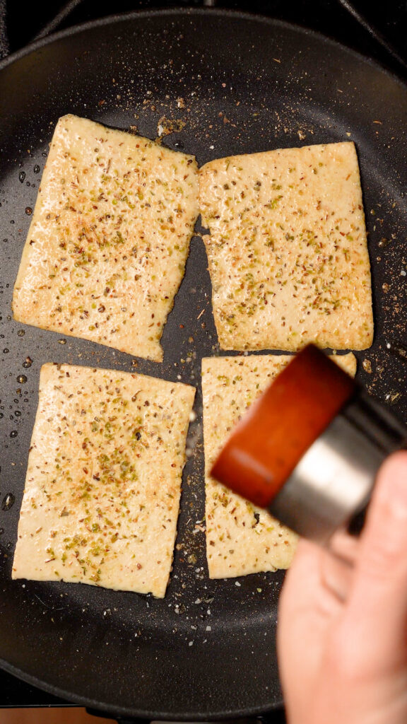 - Using a spatula lightly move the tofu slices around to coat them in oil. Sprinkle on any seasoning you like to taste. I like using Salt, Pepper, Garlic and Onion Powder, Dried Basil and Dried Oregano, maybe Smoked Paprika! Literally whatever seasoning you like. Just give the tofu slices a nice coating of it.