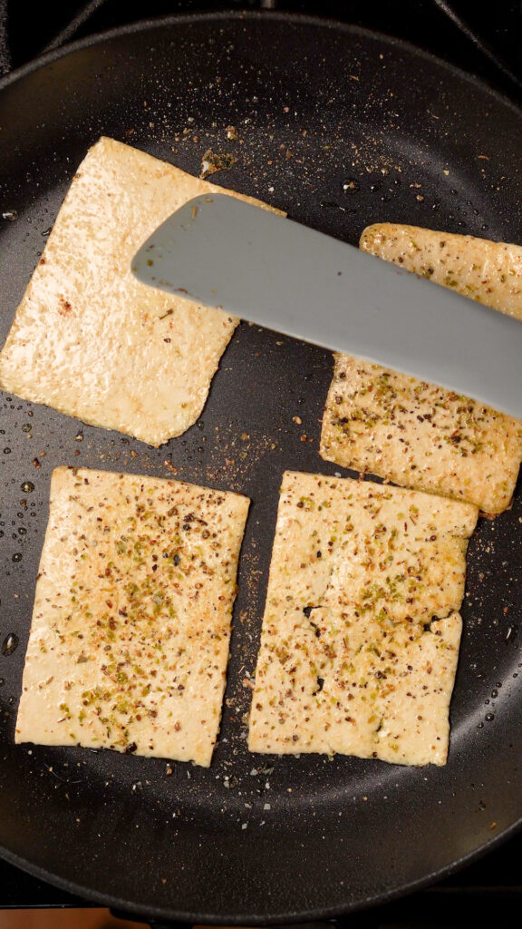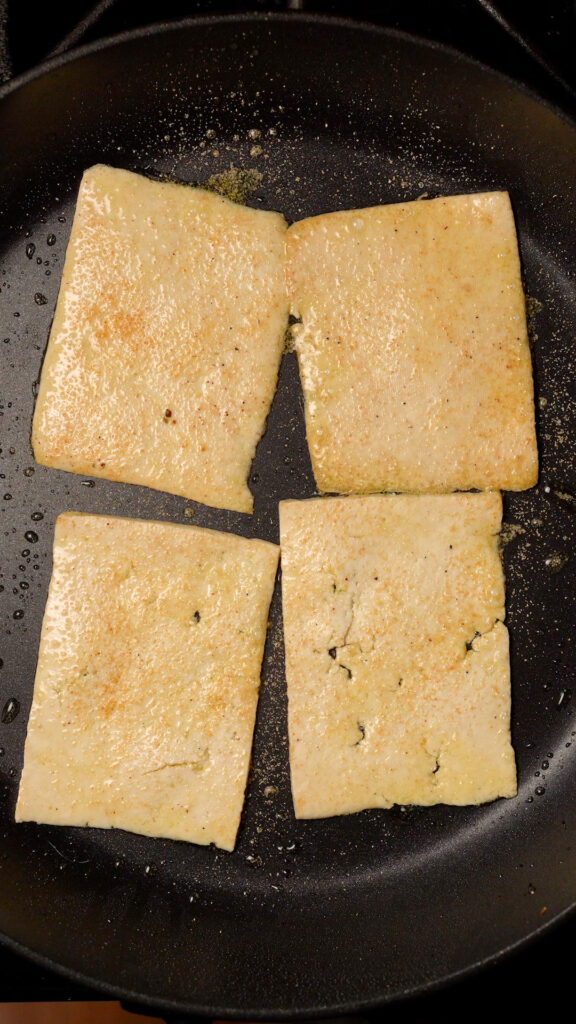 Drizzle some olive oil into a 12″ non-stick skillet over medium – medium high heat. Preheat the oil for a minute or so, and then add some of the tofu slices. I was able to do 4 at a time, but just make sure you don’t crowd the pan.