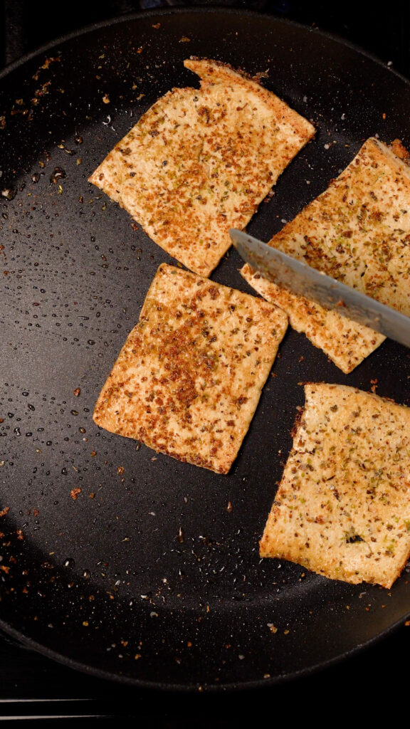 I highly recommend Super Firm Tofu as it’s vacuum packed and doesn’t require pressing. You can start slicing it right out of the package!