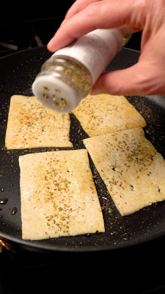After about a minute, carefully flip the slices over and season the other side. Cook for another minute and flip the slices again.
