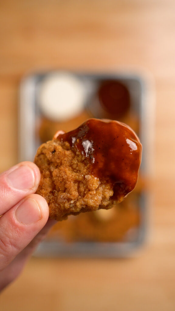 Hi, I would recommend dredging in some breadcrumbs or panko for air fried. I’ll have to make a recipe for that, but I do have an older air fryer vegan chicken recipe as well. But for this recipe, I would just dredge in the flour, then wet and then breadcrumbs. You can repeat in the wet and breadcrumbs to double dredge.