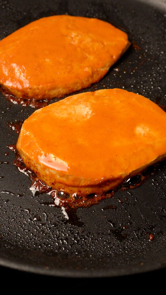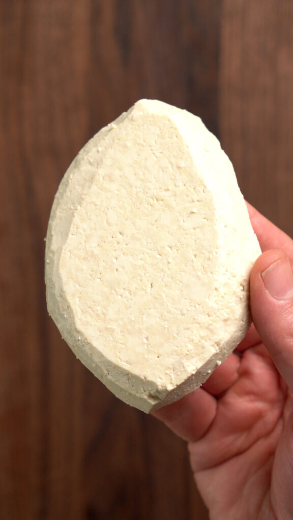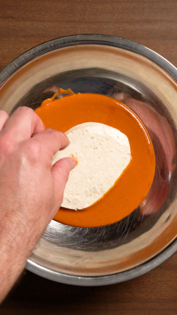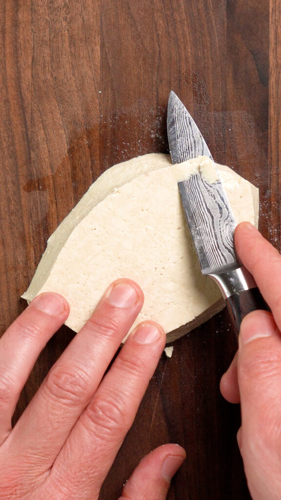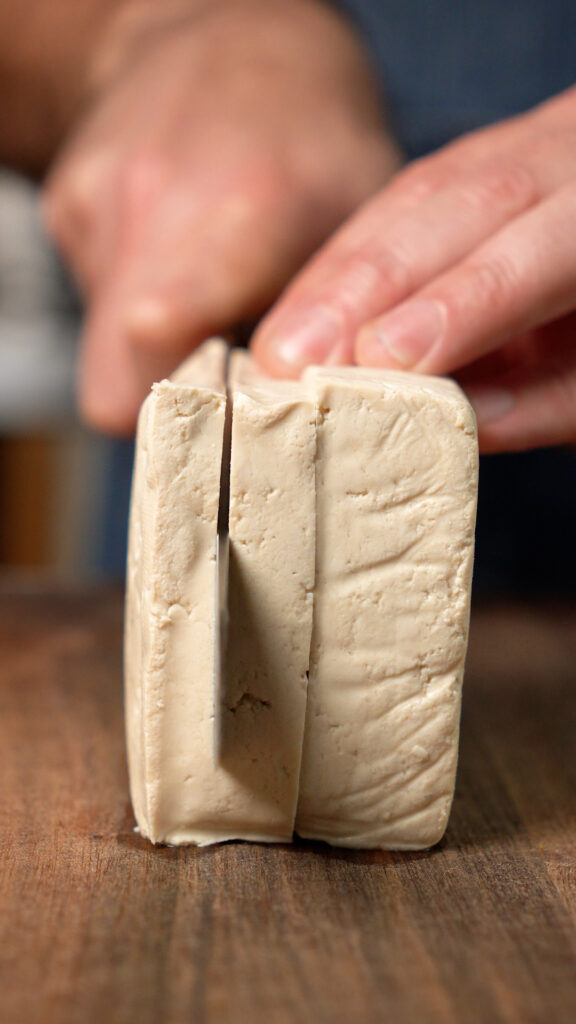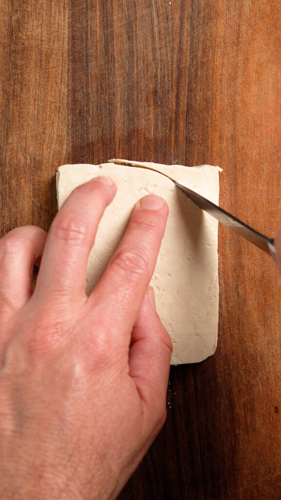 The process is quite simple! First we’ll slice our block of tofu into fillets. You can also cut the fillets into more “chicken breast” style shapes if you like.