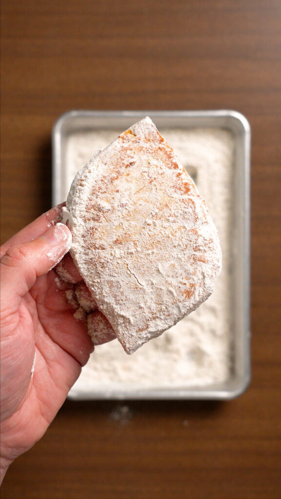 Dredge the tofu! You have a couple options. You can go into the flour, then the buttermilk, then back into the flour. Or for a thicker breading, double dredge by going into the buttermilk, then the flour, and then repeat that. I personally don’t have a huge preference, but if you like a thicker breading go for the double dredge!