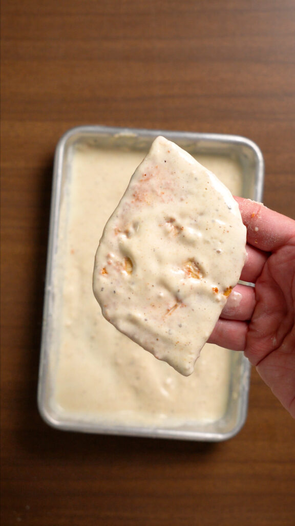 - Seasoned Flour – This will be a pretty typical seasoned flour mixture. Season the flour how you like (though I provide a detailed recipe below). Don’t skip the baking powder as this is gonna help us get those big craggy bits!