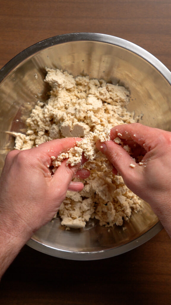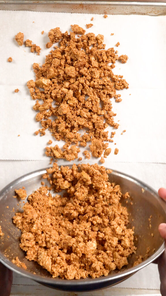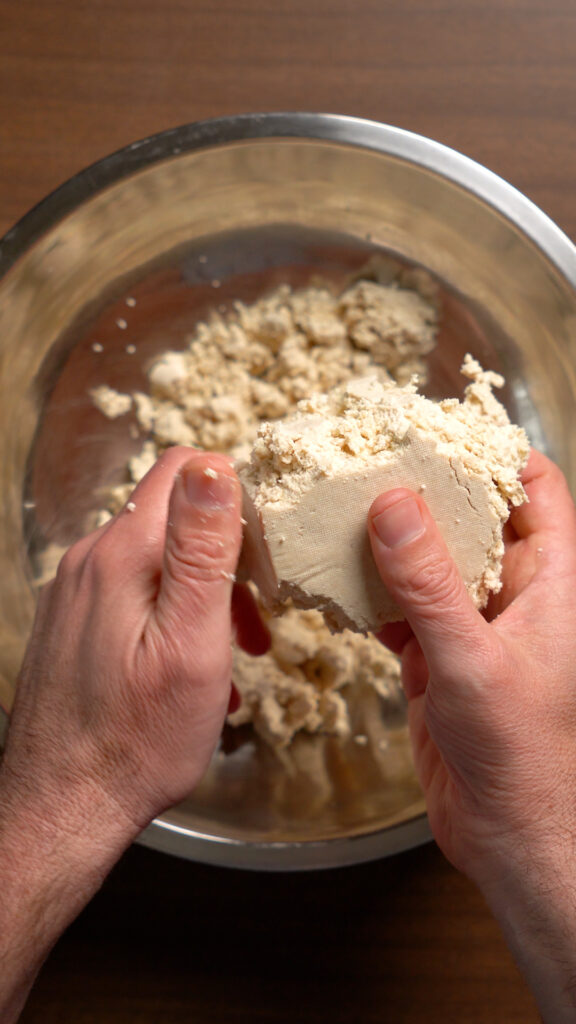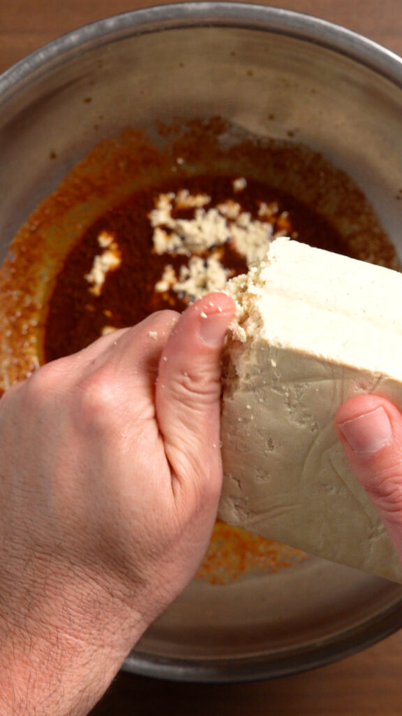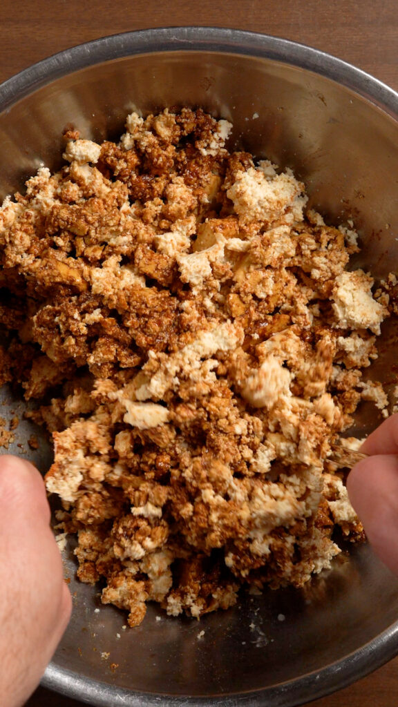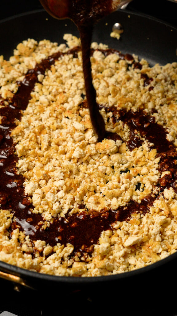 - Make the marinade by combining everything in a bowl. Pour over the crumbled tofu. With clean hands or utensils, toss the crumbles and coat thoroughly in the marinade.