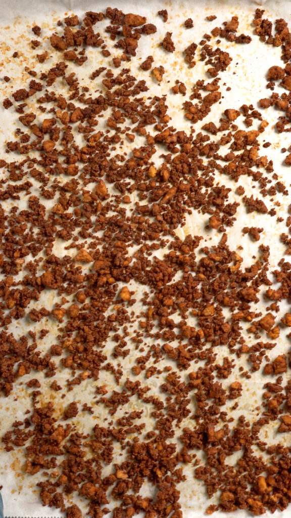 Funny story: I immediately messed up by mixing the uncooked tofu with the marinade and sticking it in the oven, plus forgetting a timer. Then, I read a comment that it was a good idea to cook the tofu before marinating it, said oops, kept stirring it around in the oven until I thought it was a good texture. Then I did some micromarinating on the stove top. I popped it in the oven on a low broil for a few minutes before throwing it on my viral Turkish pasta. This will be my new veggie ground recipe. I’ll do it right next time, though. This is a full proof recipe even if you mess it up a little. 🙂
