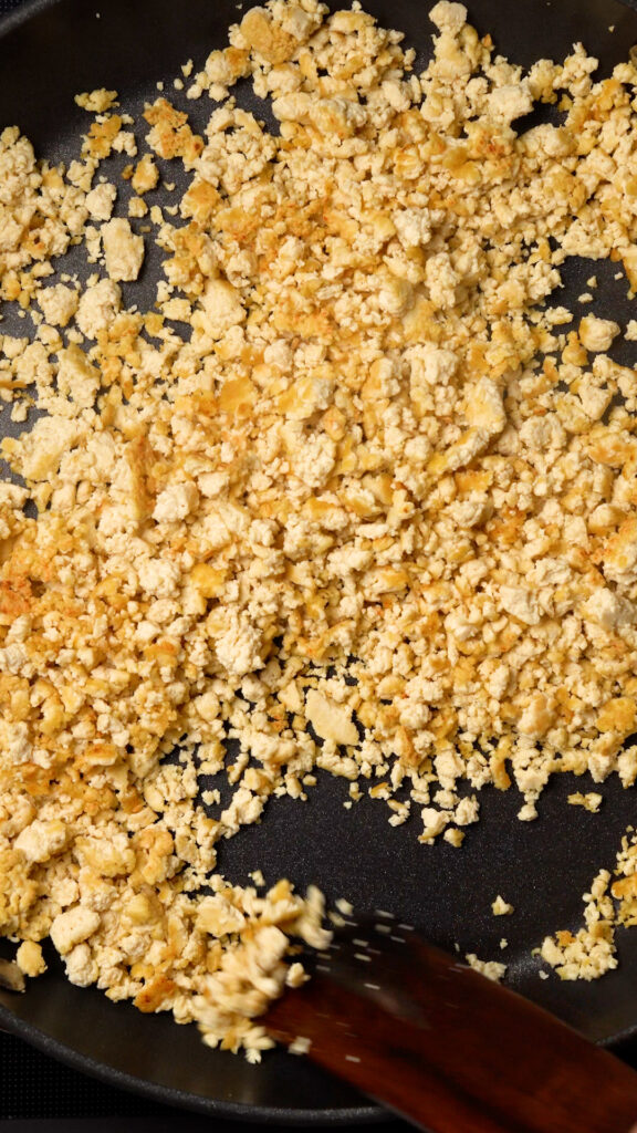 Just cook the crumbled SUPER FIRM tofu in a pan for about 10 – 15 minutes to dry it out a bit more, and get a little golden brown.