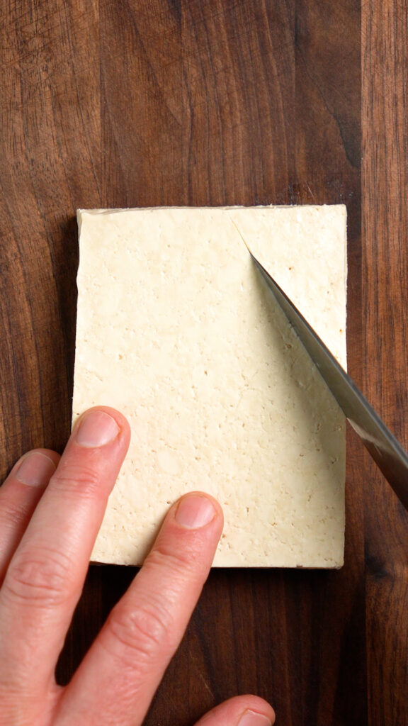 The process is quite simple! First we’ll slice our block of tofu into fillets. Then score them lightly so the marinade can penetrate a bit more. Make sure you don’t score too deeply as this will make the fillet a bit more delicate and might fall apart. You can also cut the fillets into more “chicken breast” style shapes if you like.