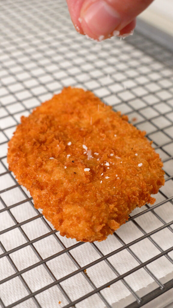 - Fry them for about 4-5 minutes or until golden brown and beautiful. Let them rest on a wire rack to cool for a couple minutes, adding a little sprinkling of salt. Slice them up, and enjoy with some shredded cabbage and rice!