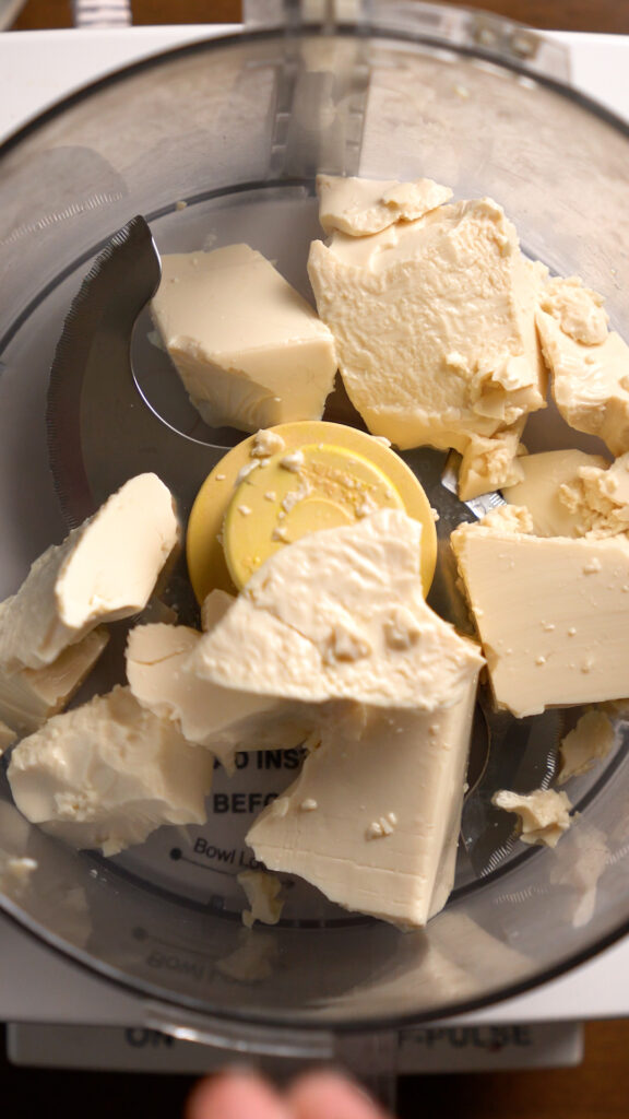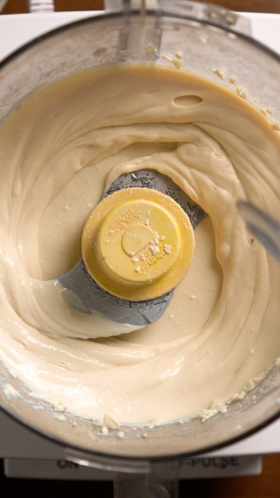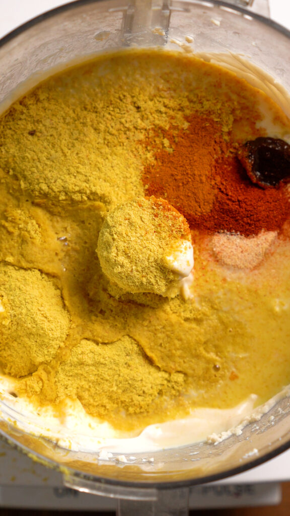 - While water boils and pasta cooks, add the Tofu to a food processor and blend until smooth, then add all the rest of the ingredients except the Tapioca Starch.Dijon Mustard Note – I recommend adding 1 tsp of Dijon, and more as you go since not all Dijons have the same level of acidity.Sazon Note – Sazon will give this a more vivid orange / yellow hue. The kind of Nutritional Yeast will also color it differently.