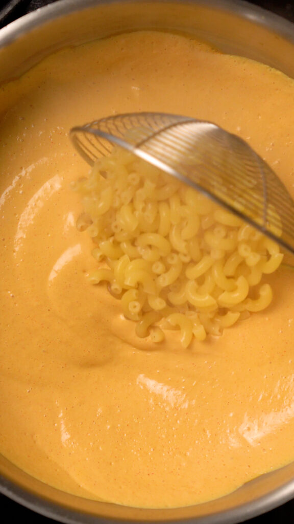 - Add that mixture to a pot and heat on medium low. Once pasta has been cooked to your liking, add it to the pot with the tofu cheese sauce. Reserve at least 1 cup of pasta water. I like to use a slotted spider spoon to transfer the pasta to the tofu cheese sauce.