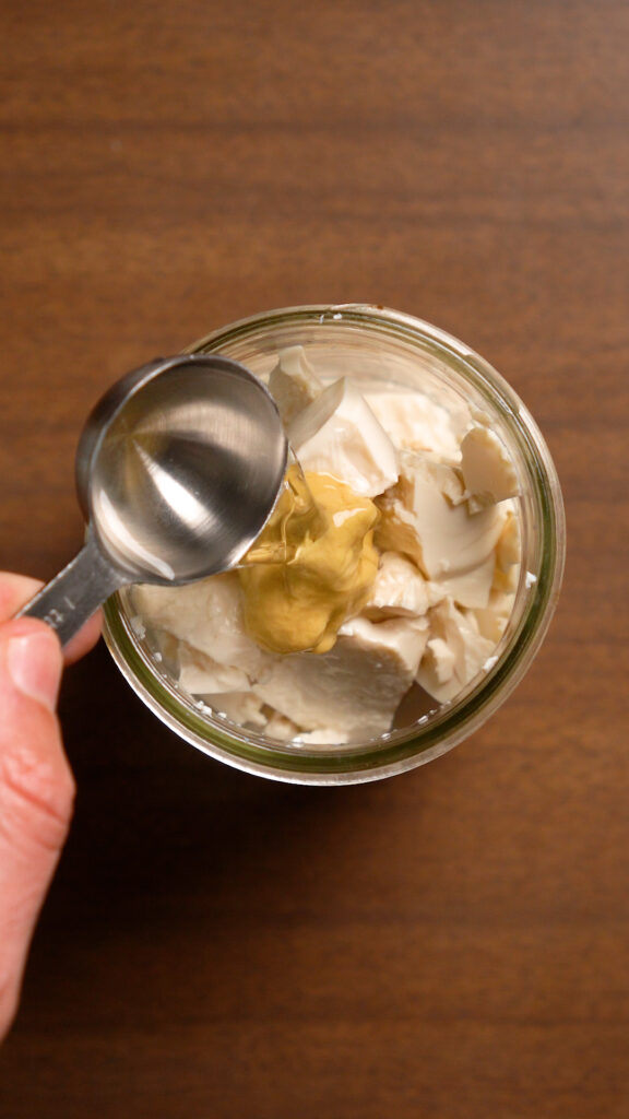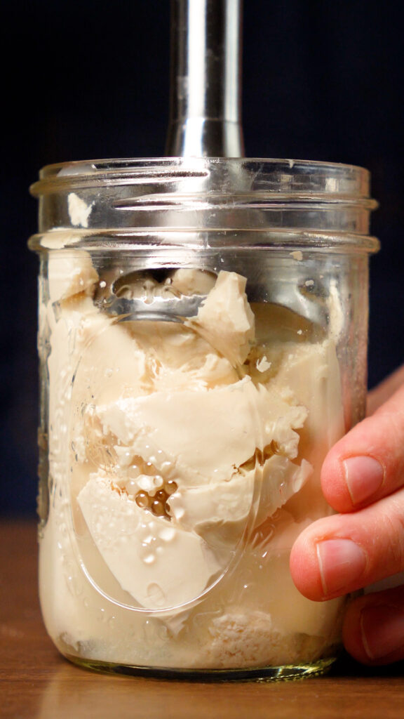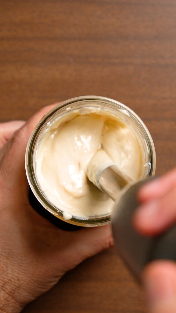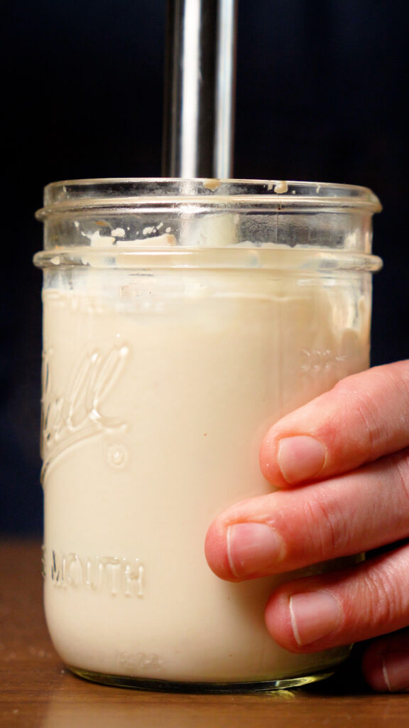 This is quite simple! You just need to add everything to a mason jar, and then using an immersion blender, you’ll blend it until it’s emulsified. Start at the bottom, and slowly move your way up.