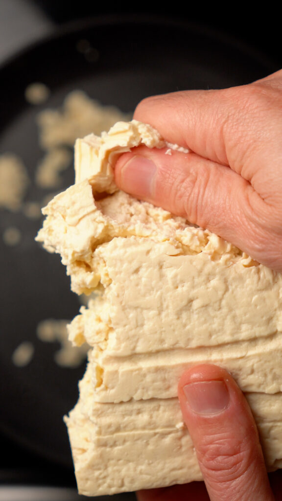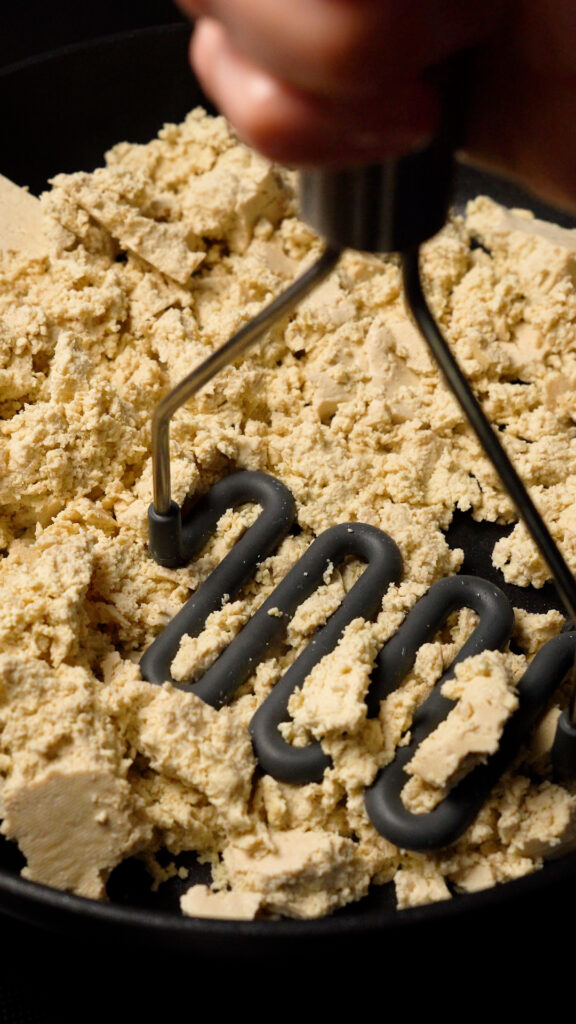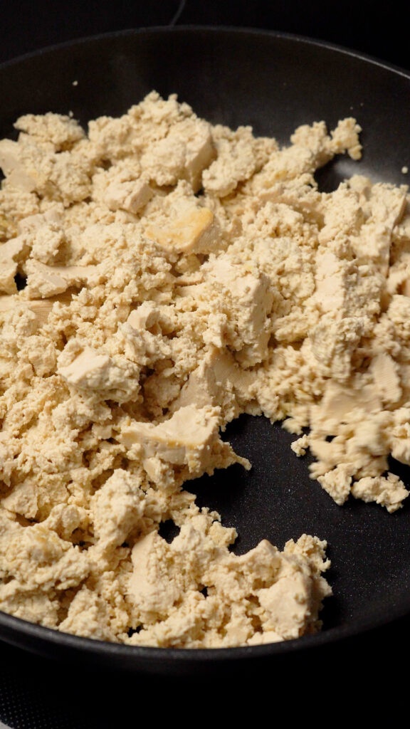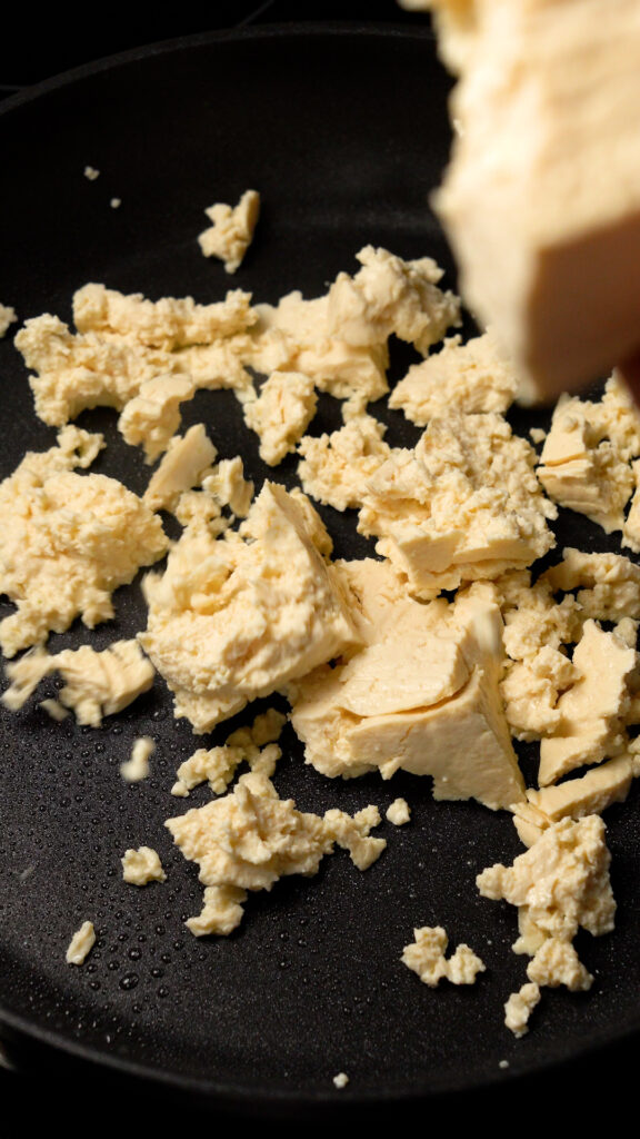 - Heat up a non-stick pan or well seasoned cast iron skillet over medium heat. Crumble the block of tofu into the pan, making the pieces as large or small as you like. You can also mash them with a potato masher as well.