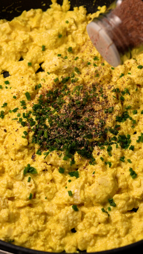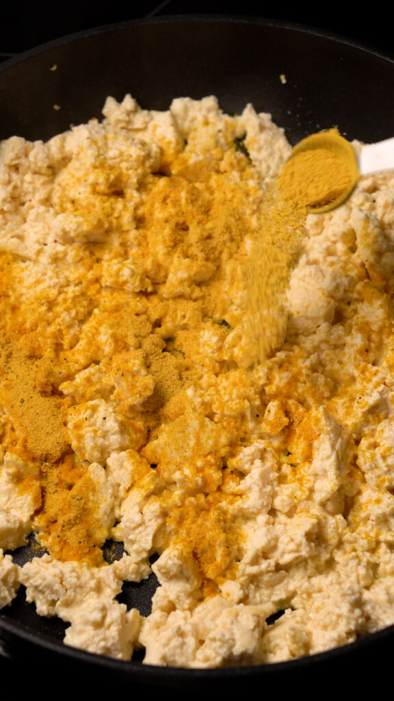 - Cook the tofu for about 2 minutes, stirring frequently. Then season with 1 – 3 tsp of the Scramble Seasoning. Adding more if you like.