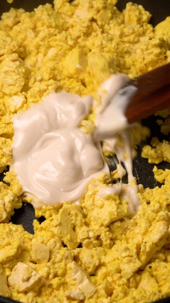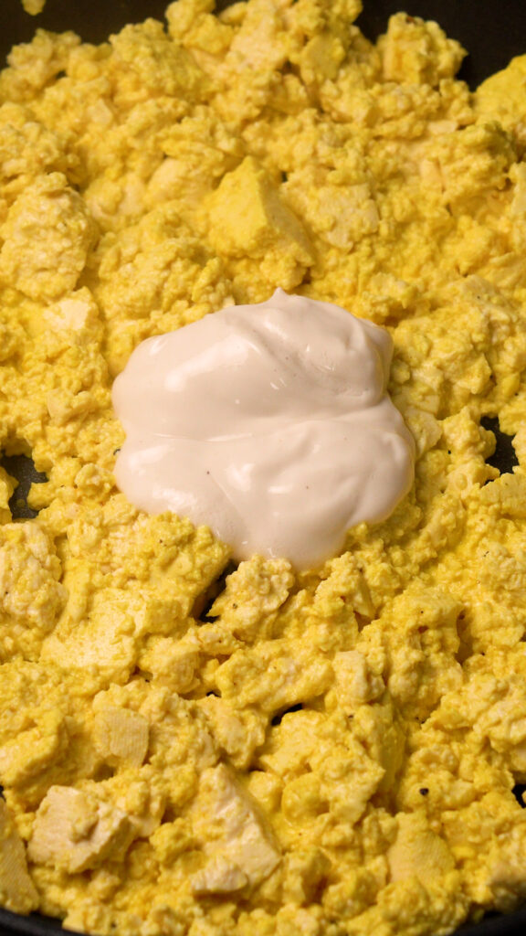 - Vegan Mayo, Cream Cheese or Yogurt – I used to recommend adding Vegan Mayo or Cream Cheese to add in some fat and richness, and those are still good for a tofu scramble. But recently I’ve really been digging adding some kind of tangy yogurt. I really like the Forager Brand or Trader Joe’s Yogurt!