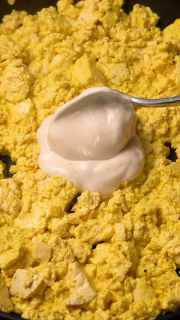 - Next add in as much Vegan Mayo, Cream Cheese or Unsweetened Yogurt as you like. I usually put in about 1/3 cup or so. But start with a couple tablespoons and add more until it’s at the consistency that you like.