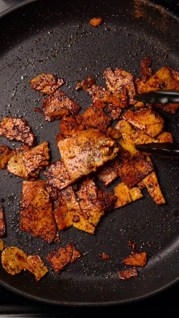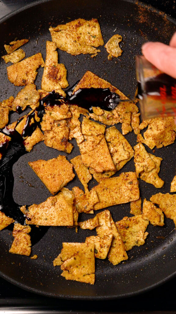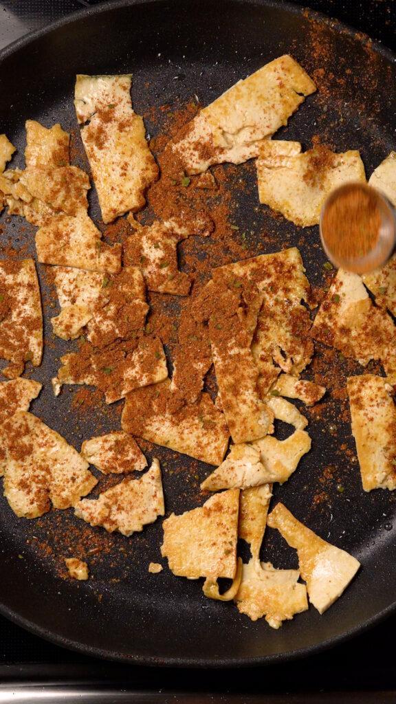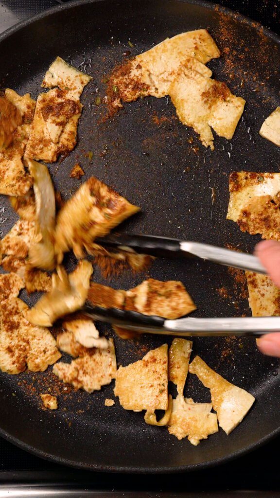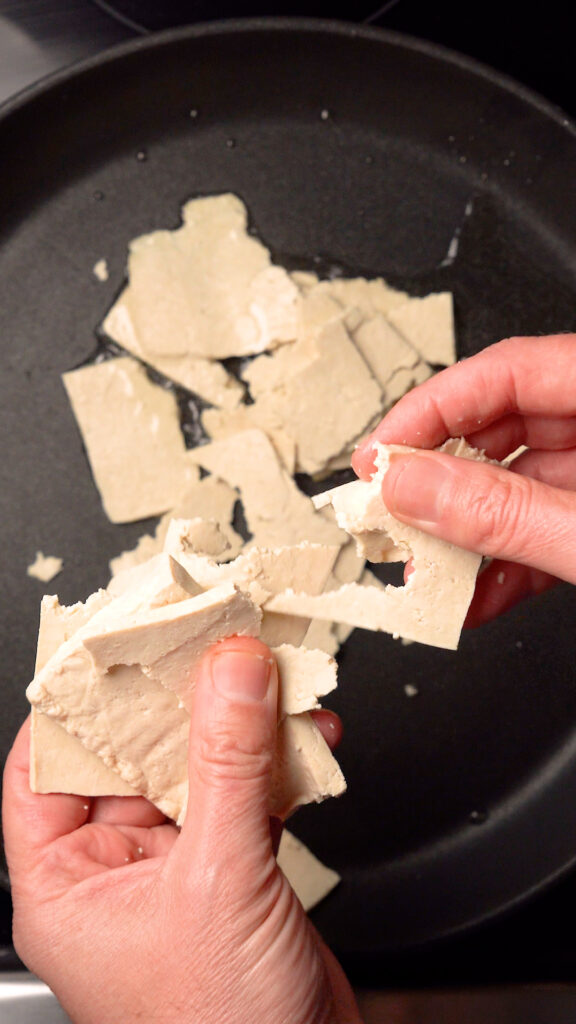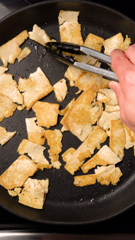 Heat some oil in a non-stick or well seasoned pan over medium heat. Add in 1/3 – 1/2 of the tofu slices. You want to avoid crowding the pan. Tear them if you want crispy edges! Cook until browned.