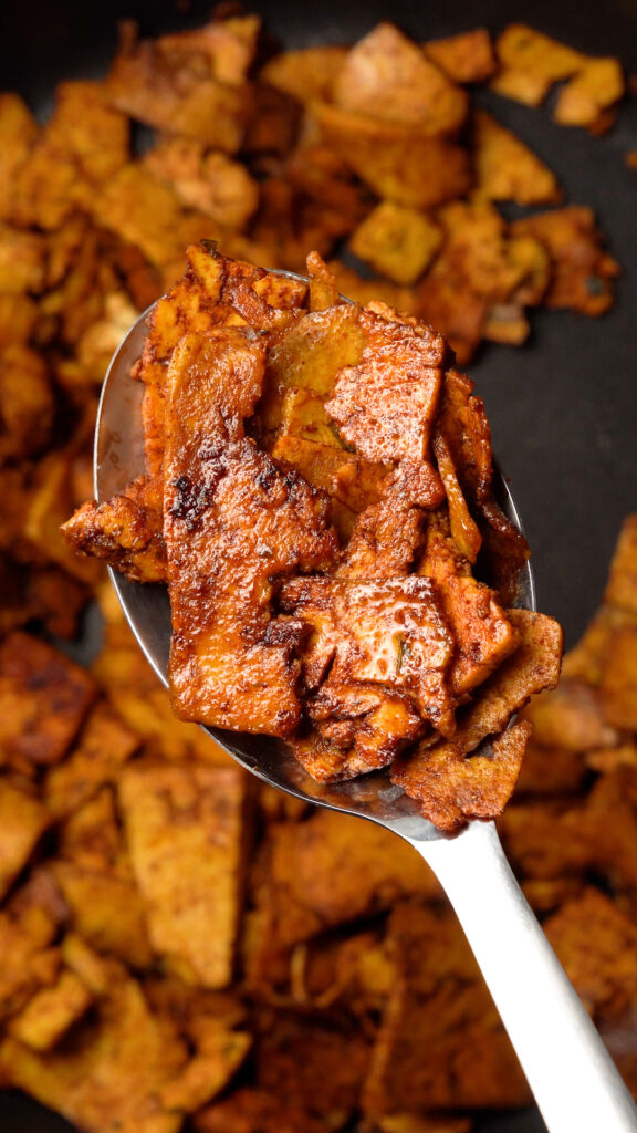 Thinly slice the tofu, don’t worry if they are perfectly the same size. You can also use a mandolin to slice them. I like to tear them to create a rougher edge that gets nice and crispy.