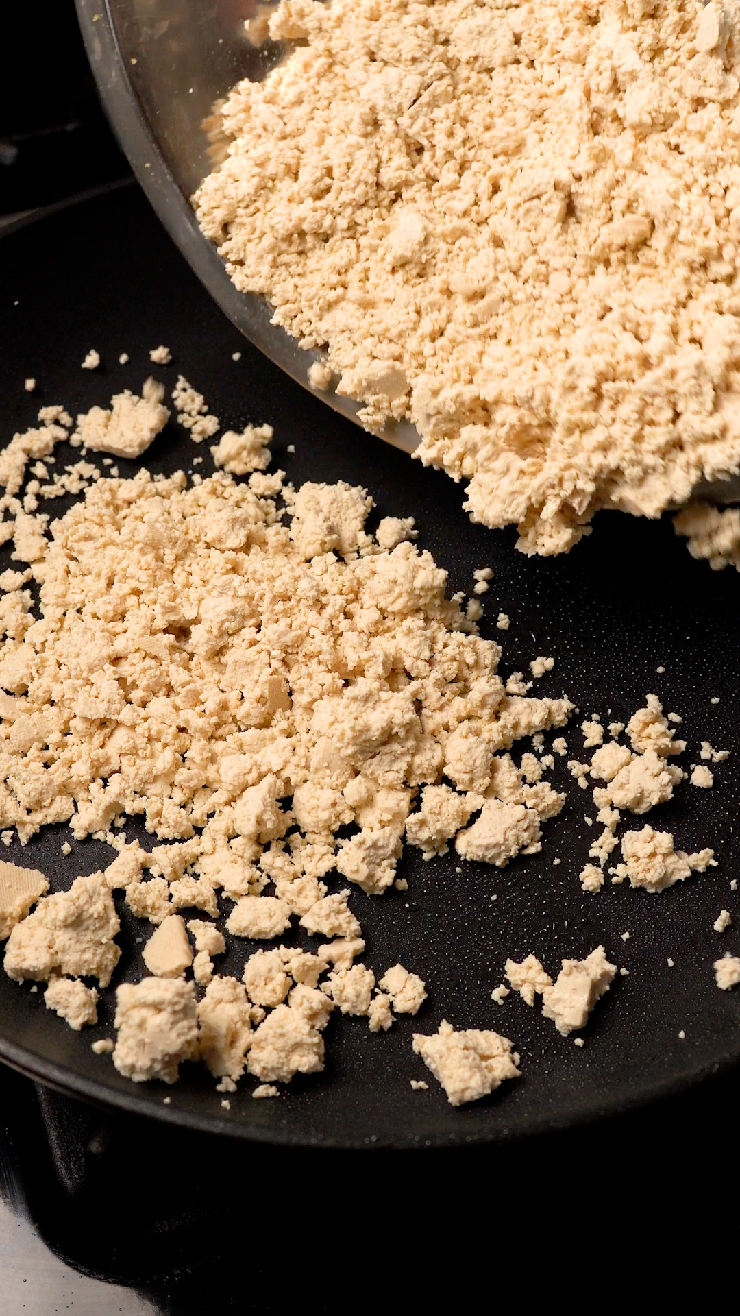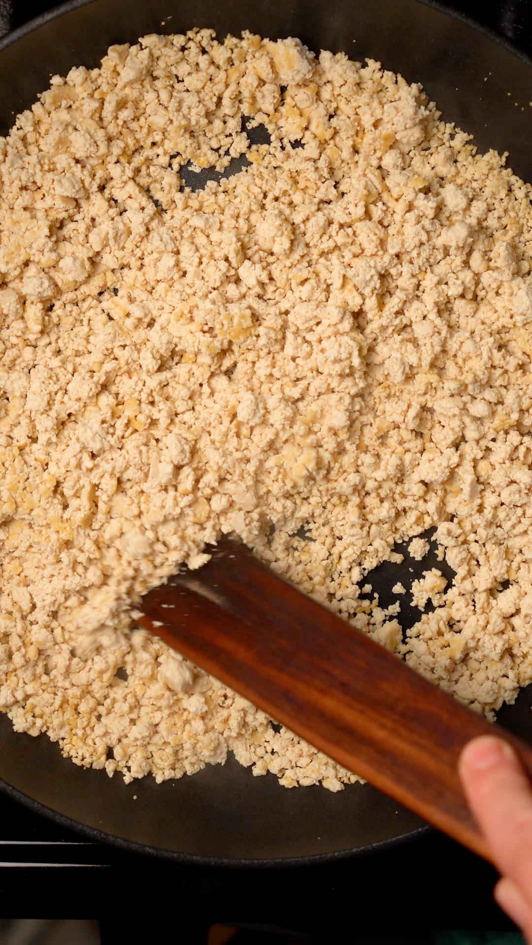 - Next in a large skillet over medium heat, cook the tofu crumbles for about 5 minutes to dry them out a bit. You may need to do this in batches or in two skillets to avoid crowding the pan (and steaming the tofu).