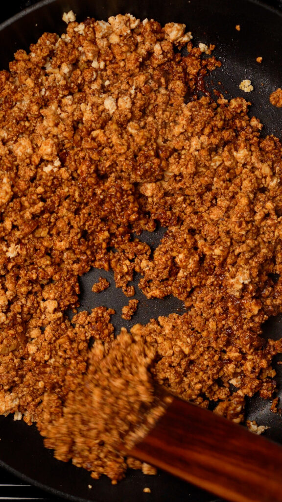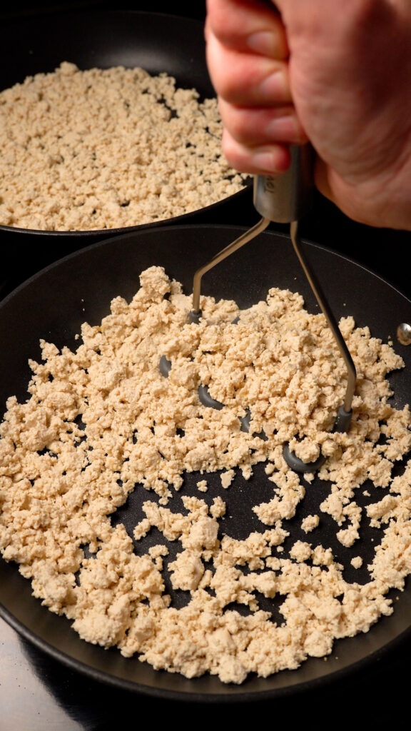 - You can use this time to continue to break up the tofu into smaller pieces with a spatula or potato masher (just make sure to use a silicone masher if you are using a non-stick pan like me).
