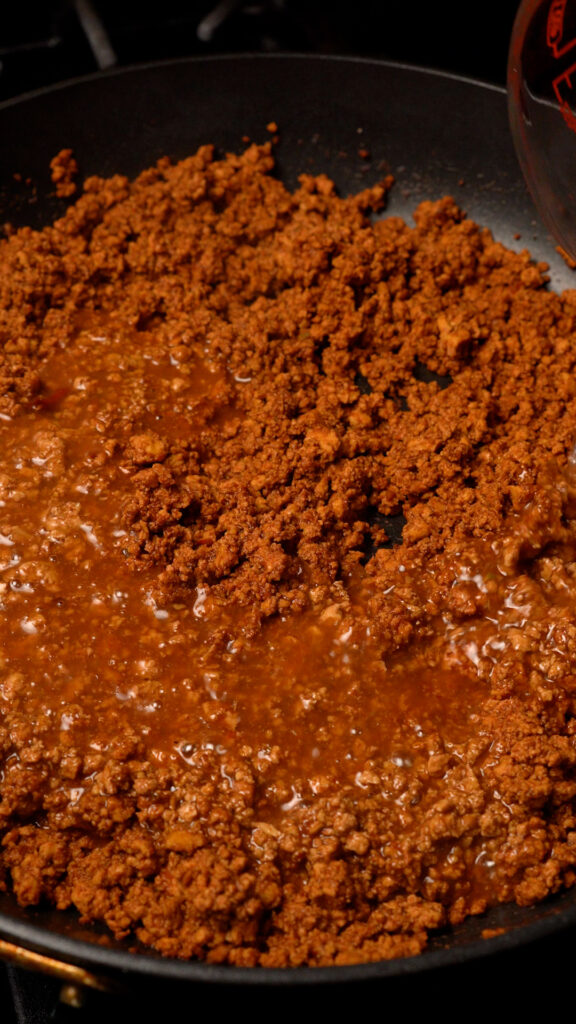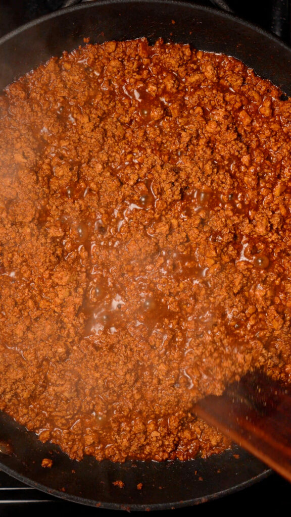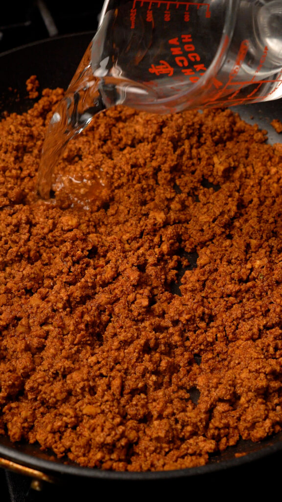 You can use this time to continue to break up the tofu into smaller pieces with a spatula or potato masher (just make sure to use a silicone masher if you are using a non-stick pan like me).