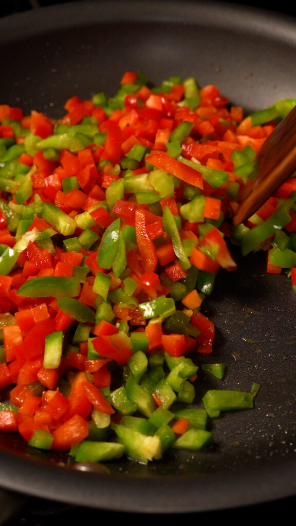 I diced up a red and green bell pepper and two jalapenos. You can add a medium onion as well, but I left it out since I made these for my wife and she has an onion sensitivity. They were still so good without them!