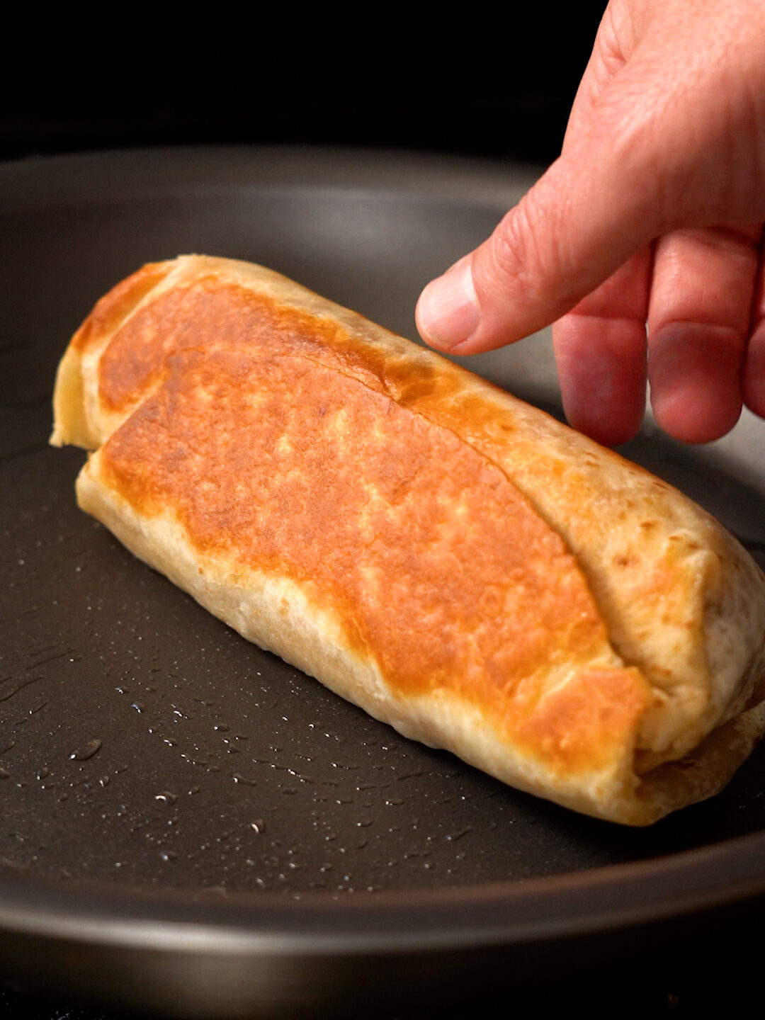 - Heat up a large burrito size tortilla until it's warm enough to bend without breaking (you can do this in a skillet, over a stove burner or in the microwave for like 15 seconds)