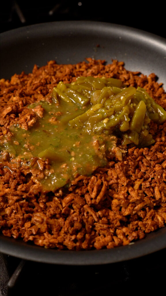 - Your tofu meat is done! If you are going to add the red or green sauce prepare them by scooching the tofu meat to the outer edges of the pan, so there's a clearing in the middle.