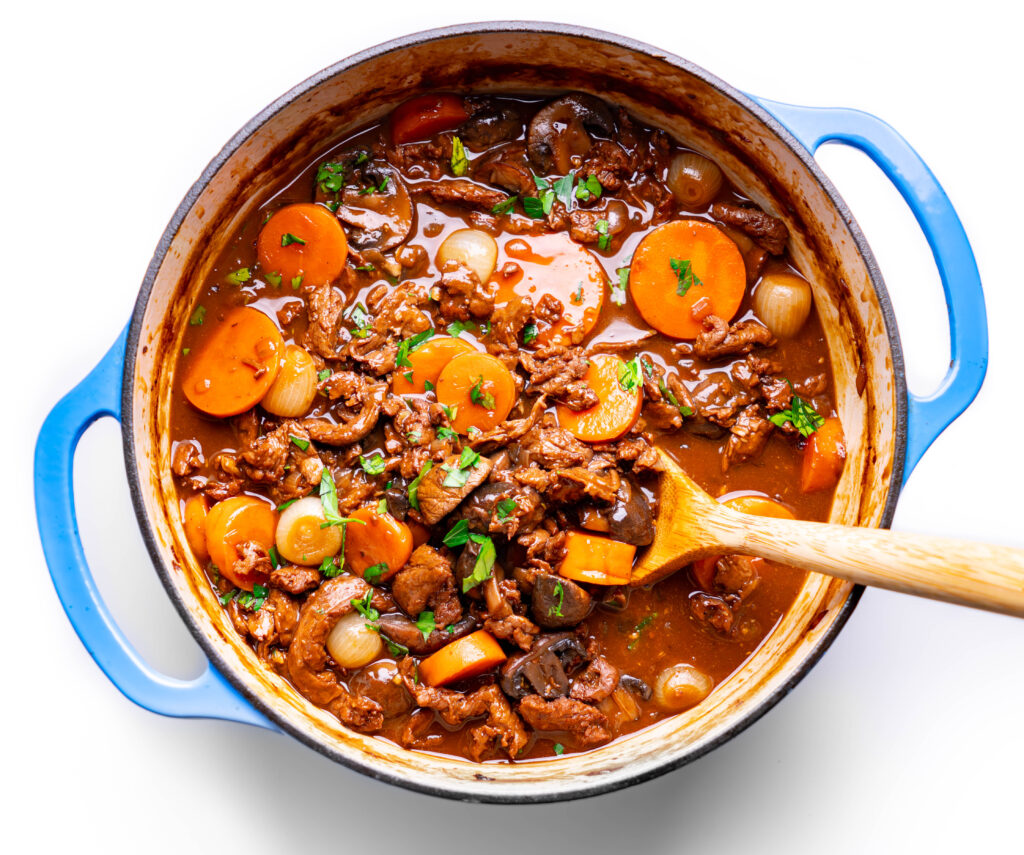 Not only is this Vegan Beef Burgundy full of flavor, but it’s WAY EASIER to make than a traditional Beef Burgundy. Typically, you need to cook the beef for hours to get it tender enough.