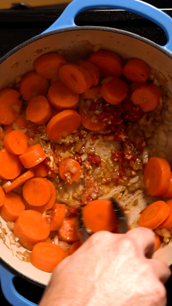 Set those aside, and cook down the onions and carrots. Add the garlic and some tomato paste and other seasonings.