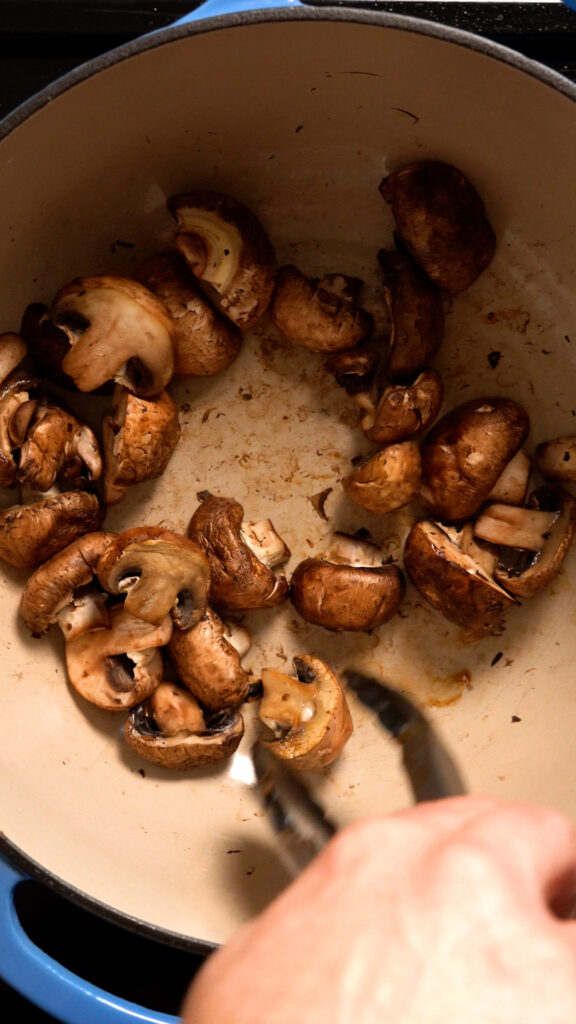 - In a dutch oven (or a large oven proof pot) over medium heat, add the mushrooms. No need for oil or anything yet. Don't crowd the pot, so you may need to do the mushrooms in 2 batches.