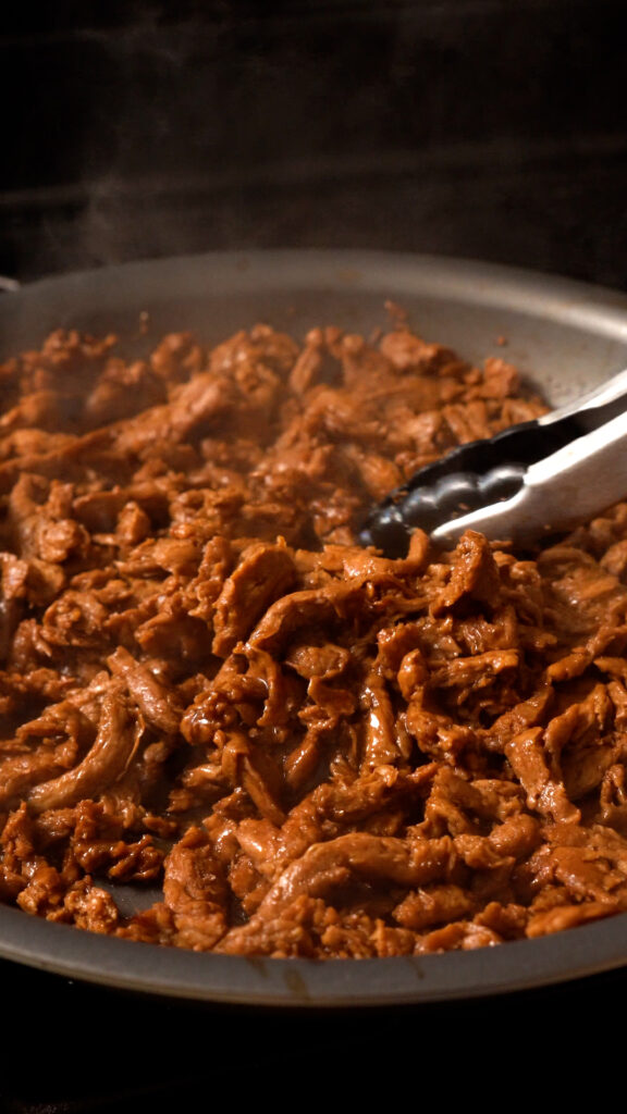 - Cook the soy curls until most of the liquid has reduced down and they are a nice dark brown color. You can add more browning sauce if you like.