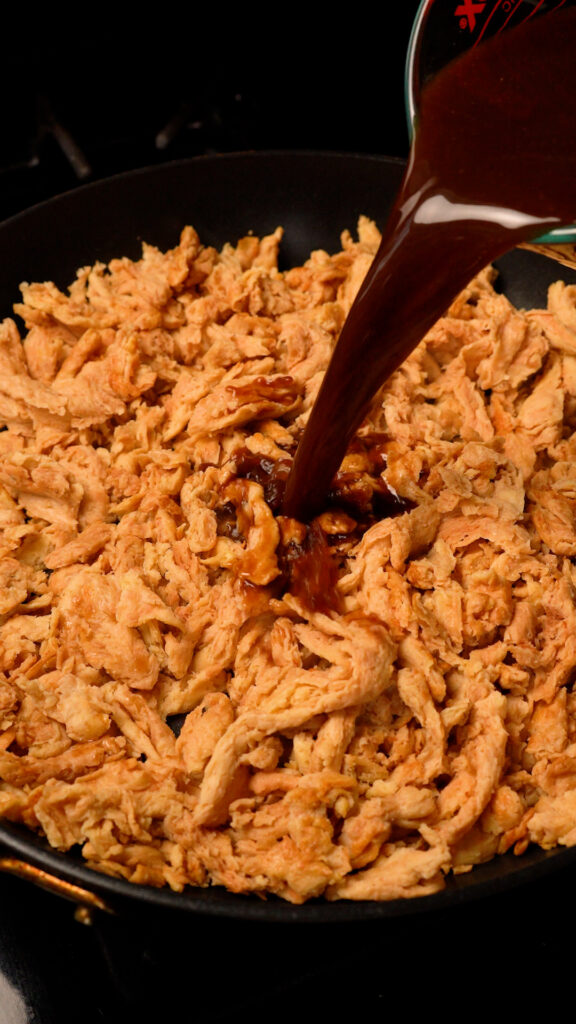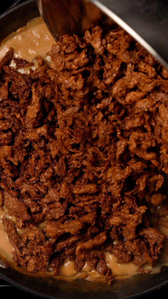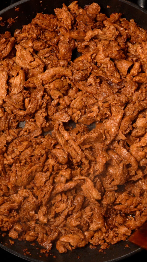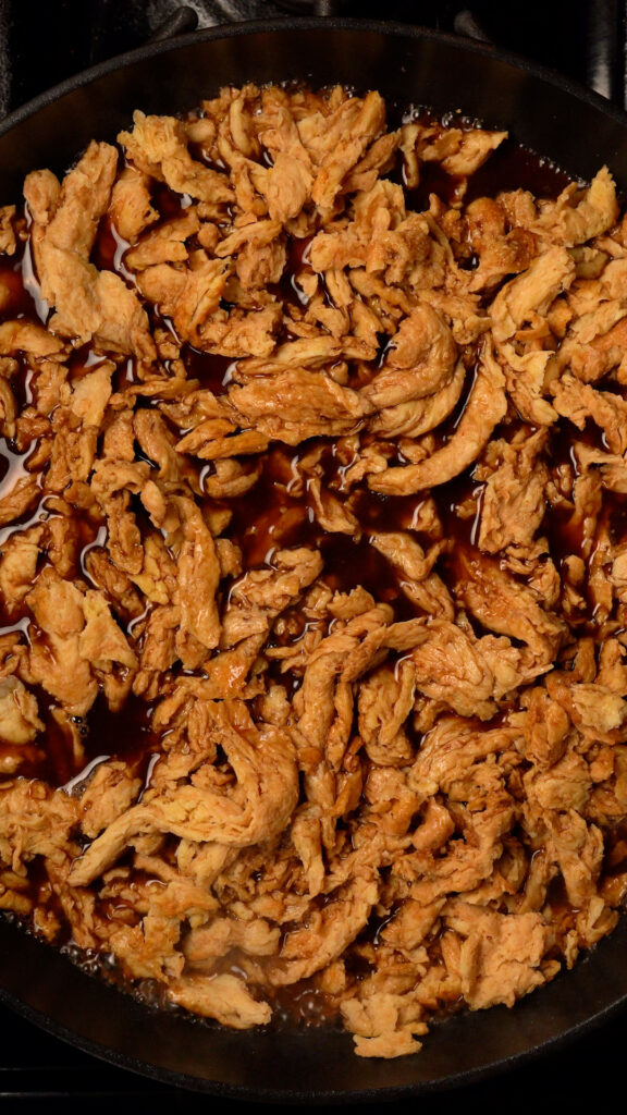 - Cook the soy curls until most of the liquid has reduced down and they are a nice dark brown color. You can add more browning sauce if you like.