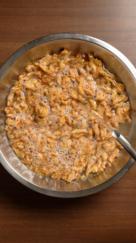 - Cover the soy curls in water and rehydrate them for 10 – 15 minutes. Then drain them and squeeze out as much water as possible.