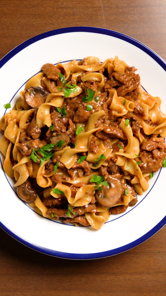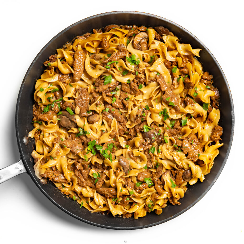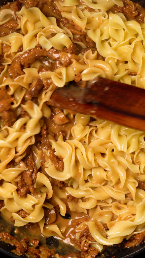 Beef Stroganoff typically uses onions, mushrooms and garlic too. They all work wonderfully together in this dish so don’t skip ’em! Feel free to add some chopped fresh parsley or chives at the end of cooking too.