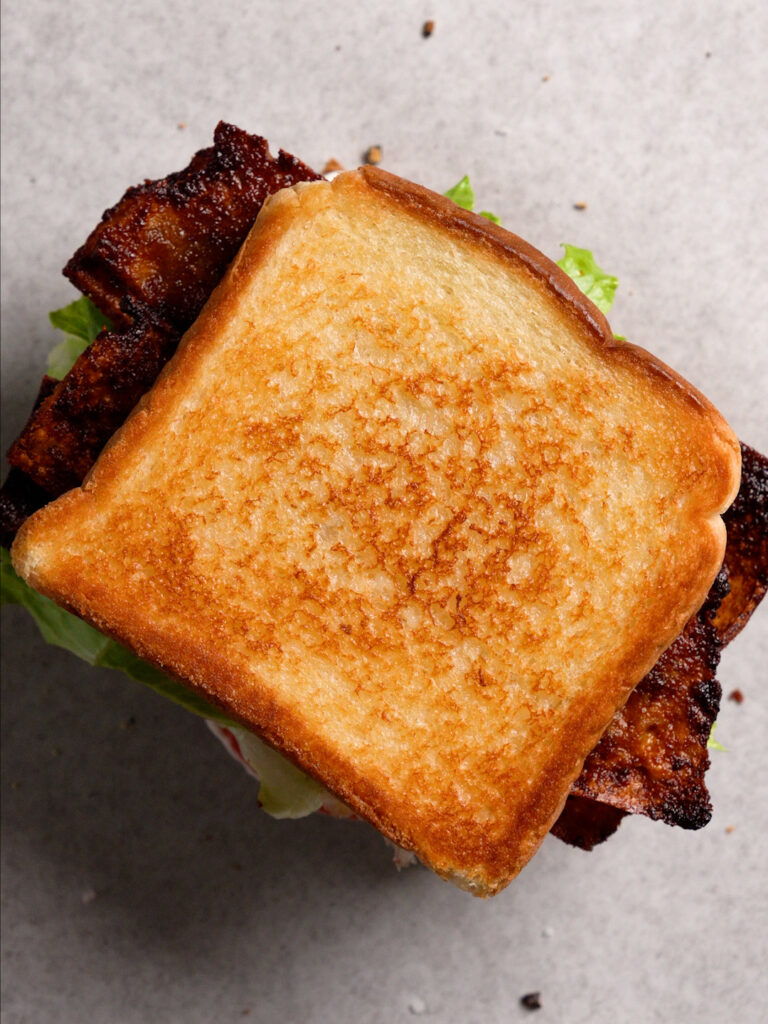 - Spread as much Vegan Mayo as you'd like on each slice of bread (not on the same side that you buttered and fried though, the dry toasted side). Then layer the bottom slice with tomato (don't forget to add some salt and pepper to the tomato slices), lettuce, and the vegan bacon. Cut into triangles and dig in!