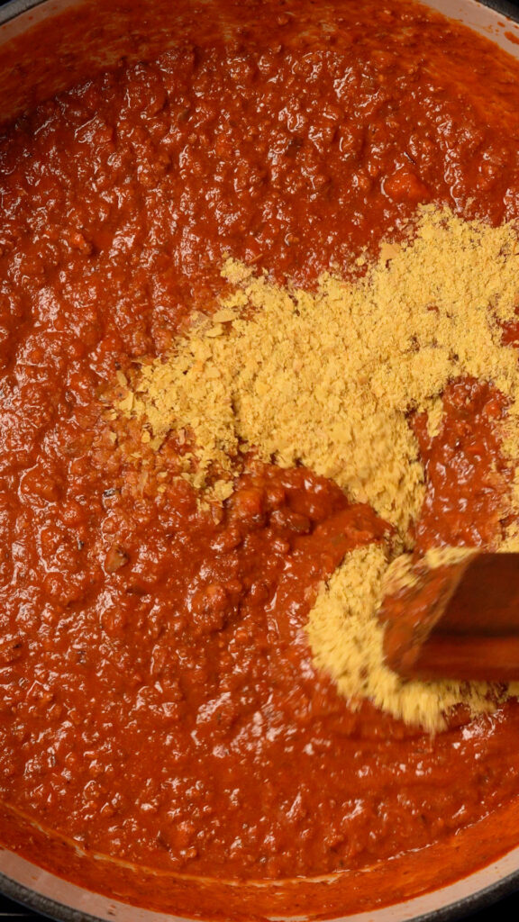 - Fish out the Bay Leaves, and add in the Plant Milk and Nutritional Yeast. Stir to incorporate, and simmer.