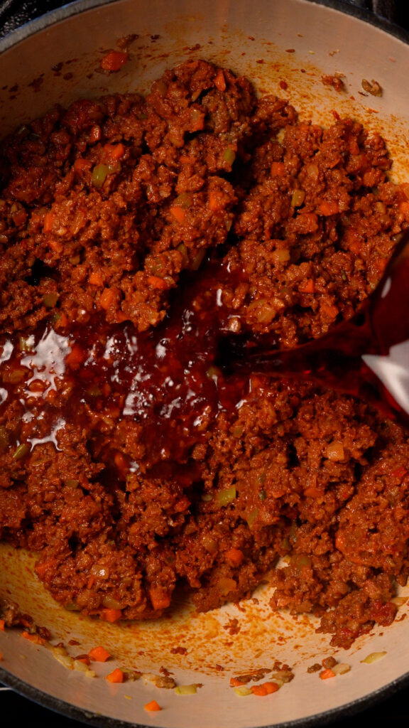 - Add in the Red or White Wine (or Veggie Broth) and stir to incorporate. Then add the Crushed Tomatoes or Passata, Vegan Worcestershire, Dried Thyme and Bay Leaves. Stir to incorporate.