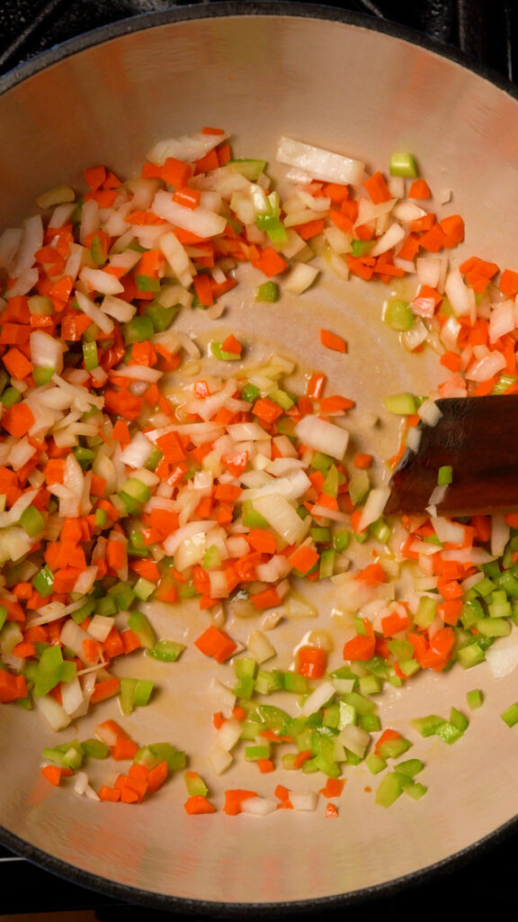 - Once the butter is melted, add in the onion, carrot and celery. Stir to coat and cook until the veggies have softened, about 10 – 12 minutes.
