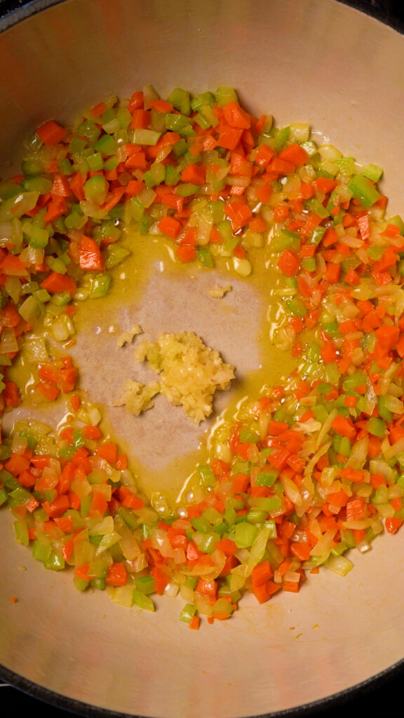 Melt the vegan butter and Olive Oil over medium heat, add in the onion, carrot and celery. Stir to coat and cook until the veggies have softened, about 10 – 12 minutes.