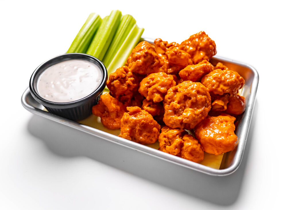 - In a large bowl, smother them in BUFFALO SAUCE, and toss them around to coat. Serve immediately with some vegan ranch or blue cheese and ENJOY!