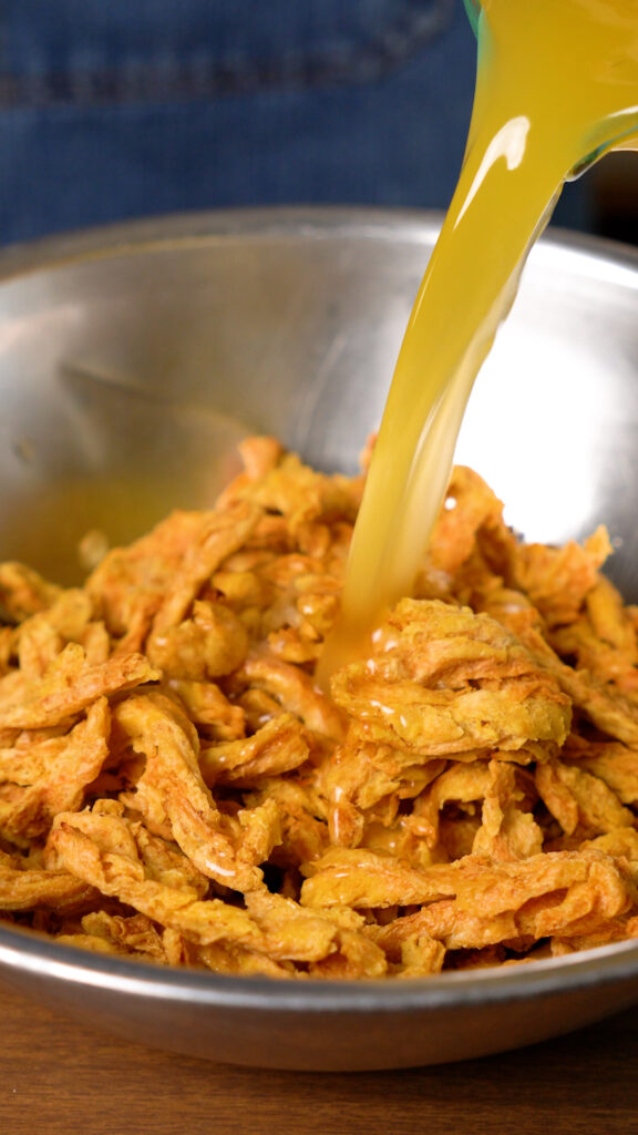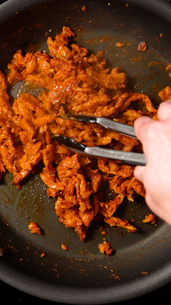 This couldn’t be easier! If you’re using my Soy Curl Chicken recipe, first prepare a batch of those. I like to make these in bulk and freeze them so I can use them whenever I need.