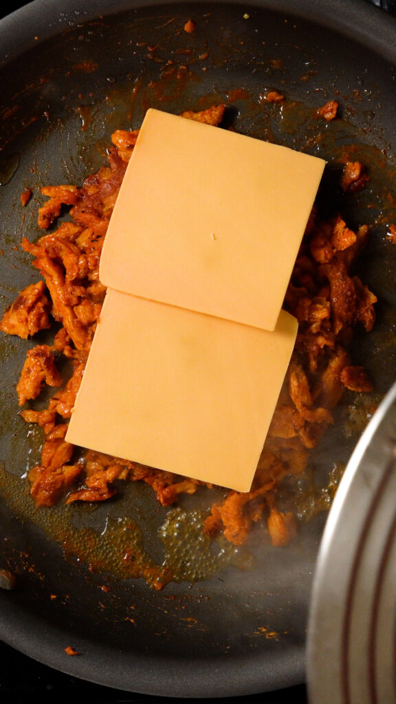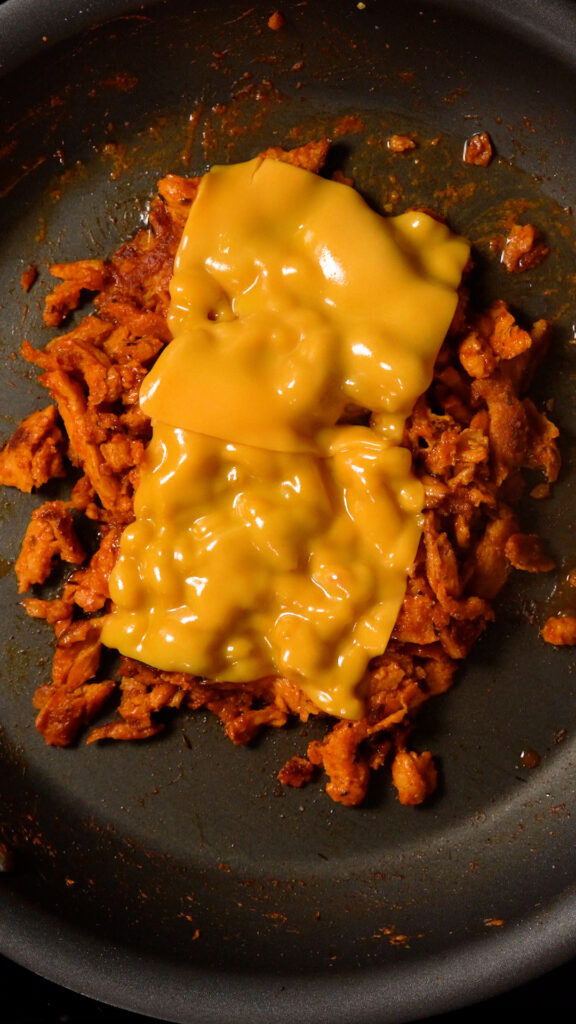 - Depending on how cheesy you like it, add 4 – 8 slices of your favorite vegan cheese. You can also use shreds if you like. You can either let the cheese melt by covering the pan, or you can simply stir it all together and let the cheese melt as you stir it.The idea is to get the soy curls covered so each bite is nice and CHEESY!
