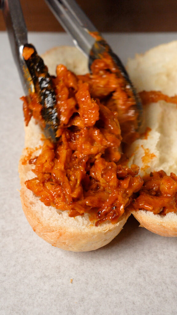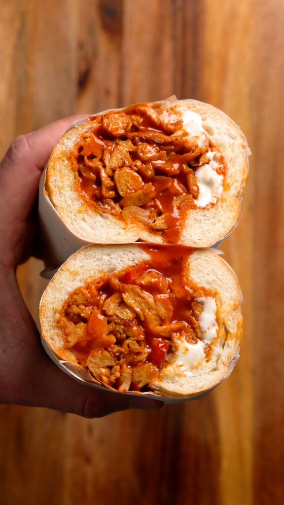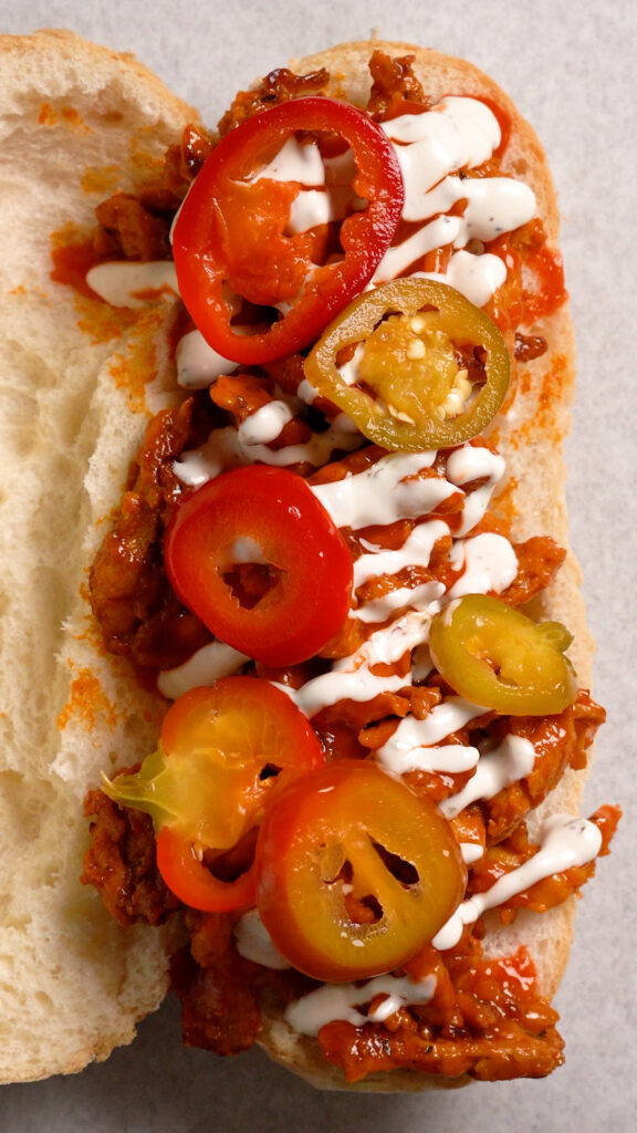 Then you simply need to load up your roll with the Vegan Buffalo Chicken, more Buffalo Sauce, Vegan Ranch or Blue Cheese, and I like to add some Cherry Peppers or Pepperoncinis too!