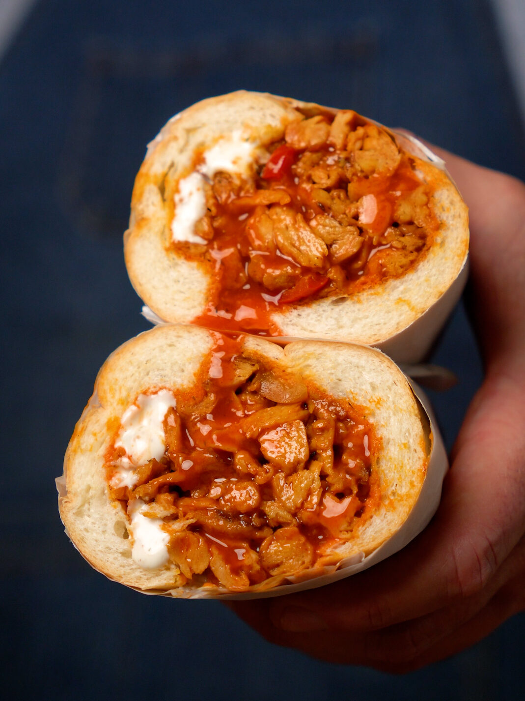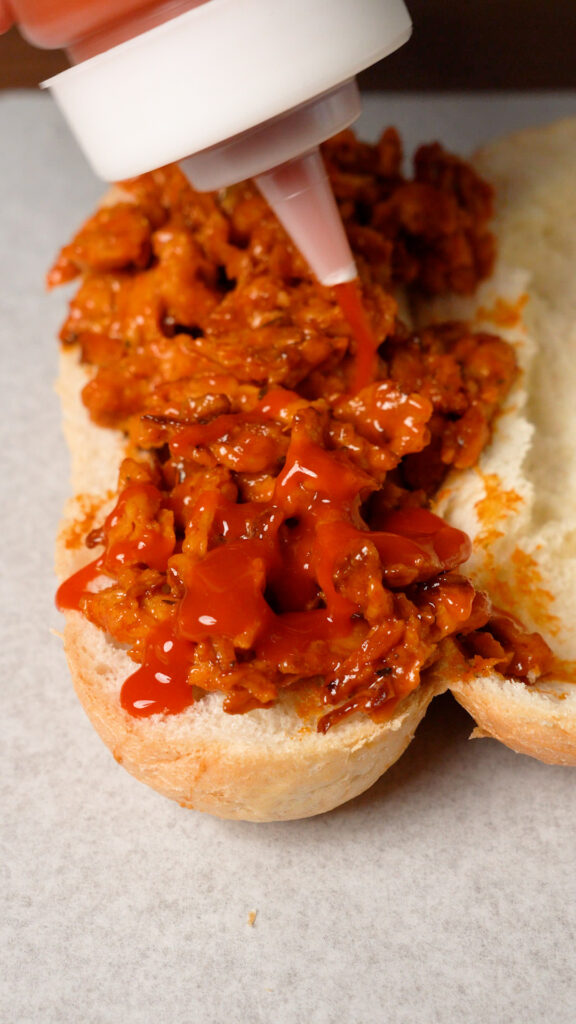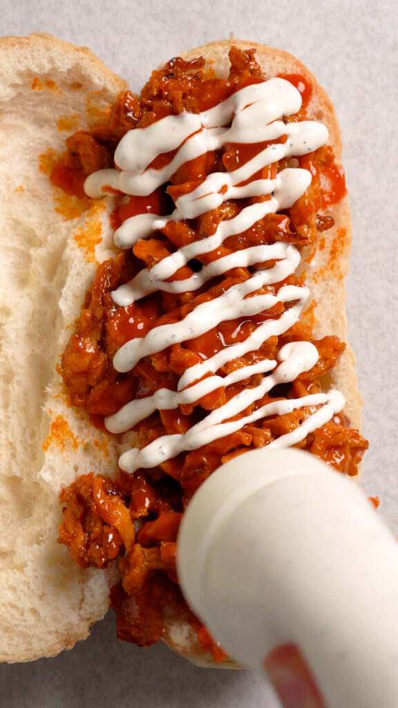 - Split your rolls in half, leaving a hinge. You can hollow them out a bit if desired. Then layer 1/4 of the Buffalo Soy Curls in each one. Next drizzle with more Buffalo Sauce, as much Vegan Ranch as you'd like too!I like to toss on some Cherry Peppers or Pepperoncinis too, but it's optional! Use whatever you'd like, Green Onions or Chives, Grilled Onions, whatever you like!Wrap it up in some Deli Sandwich Paper if you like and dig in!