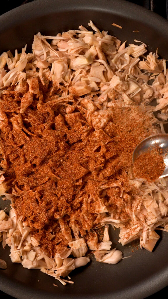 - Preheat a 12 inch skillet over medium heat. Add a little oil and then the jackfruit, stir to coat in the oil. Cook for about 3 – 4 minutes and add in the dry rub. I suggest adding in about 1 Tbsp at first and tasting, adding more if you like.
