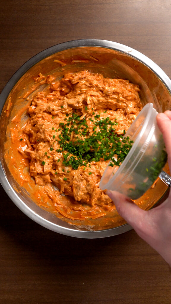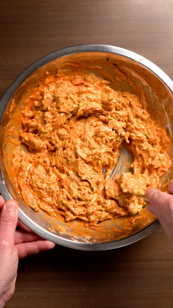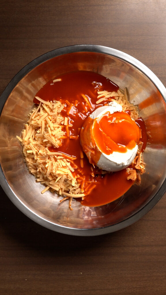 - Add the cooled jackfruit, the Vegan Cream Cheese, Cheddar Shreds, Buffalo Sauce, Ranch, Nutritional Yeast, Chopped Chives, and Onion Powder to a mixing bowl and combine everything thoroughly.